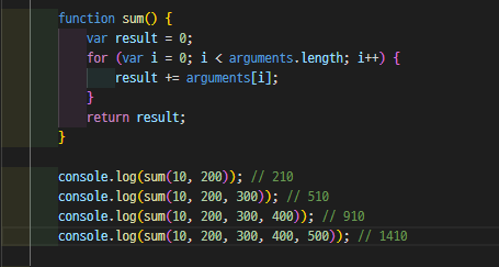 arguments객체에 담긴 매개변수 값을 매개변수의 개수(length)만큼 반복해서 더해주고 있다.