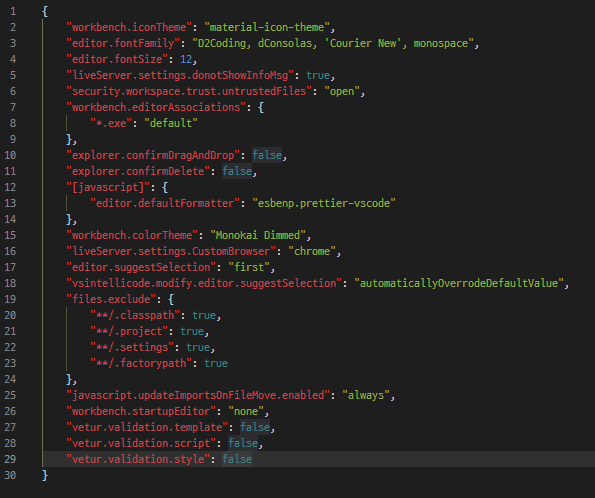 F1>Preferences:Open Settings (JSON) 설정으로 들어가서