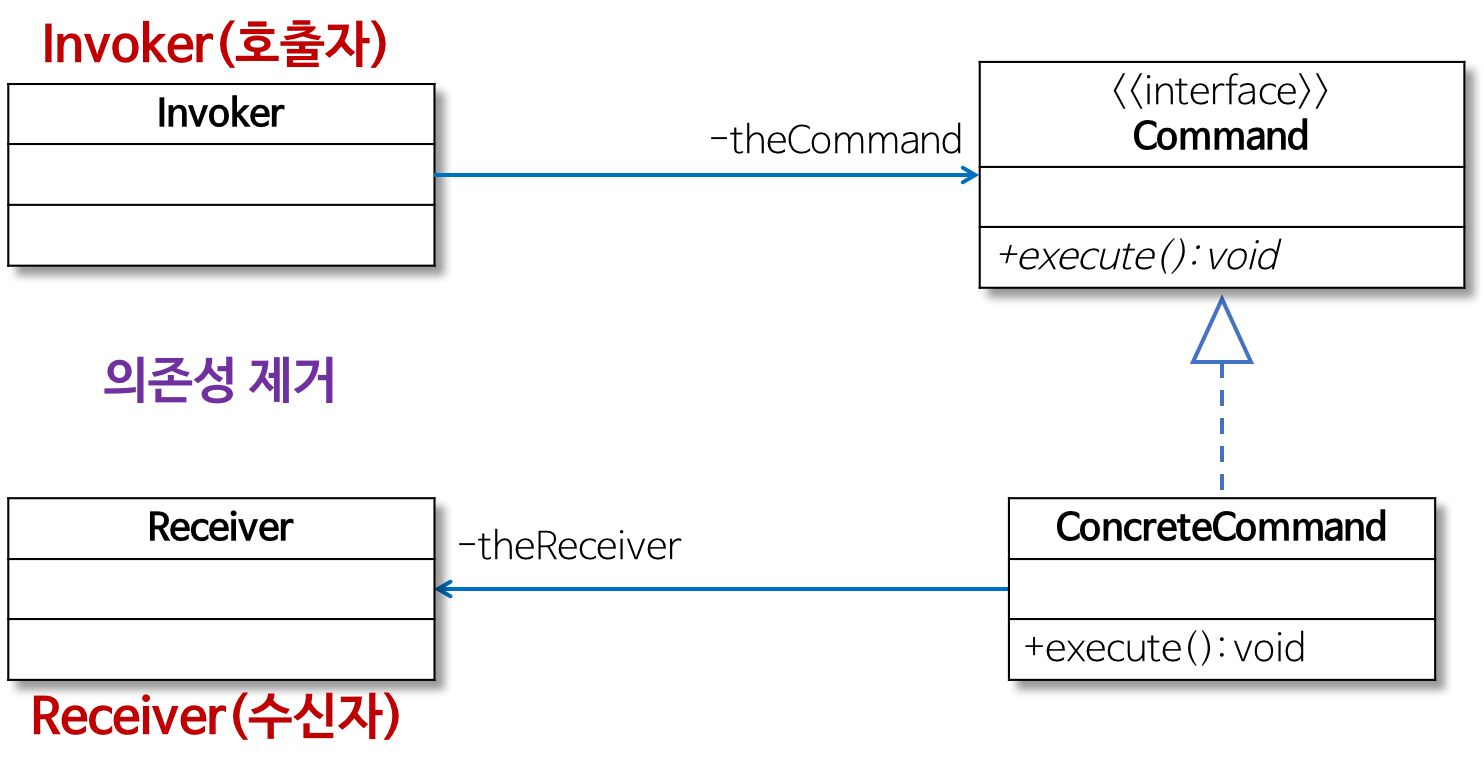 - 실행될 기능을 캡슐화함으로써 기능의 실행을 요구하는 호출자(Invoker) 클래스와 실제 기능을 실행하는 수신자(Receiver) 클래스 사이의 의존성을 제거한다. 따라서 실행될 기능의 변경에도 호출자 클래스를 수정 없이 그대로 사용 할 수 있도록 해줌.