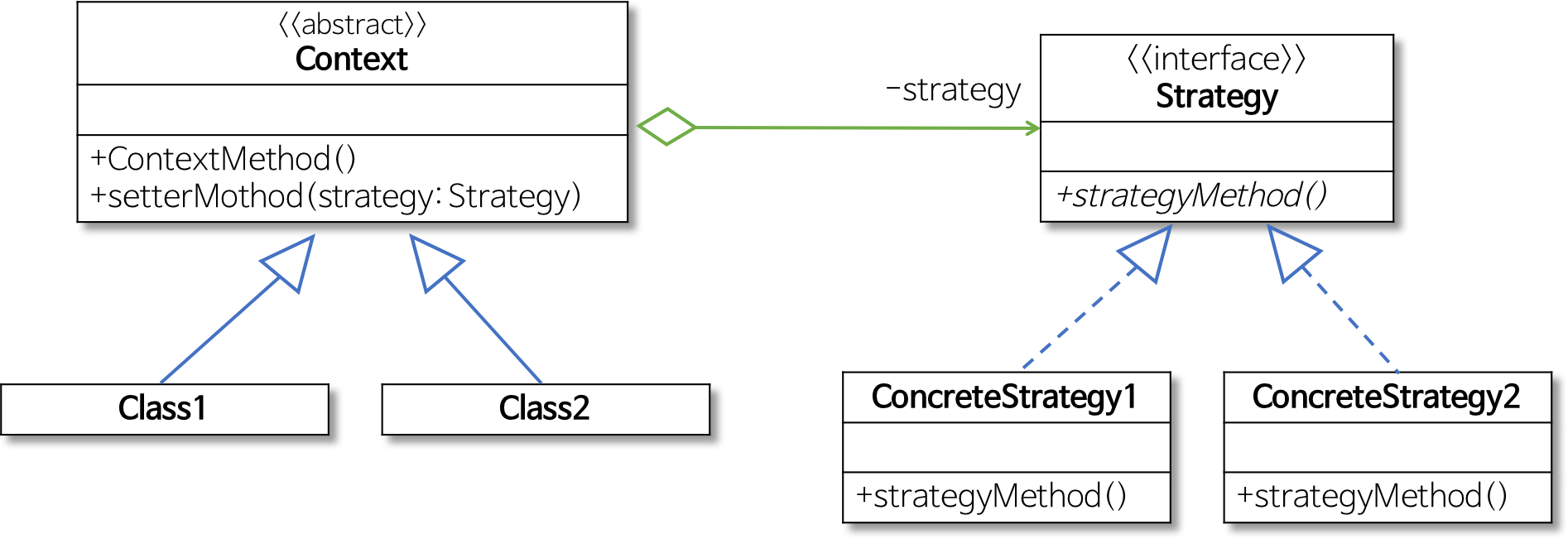 - ConcreteStrategy : "Strategy Pattern"에서 명시한 알고리즘을 실제로 구현한 클래스