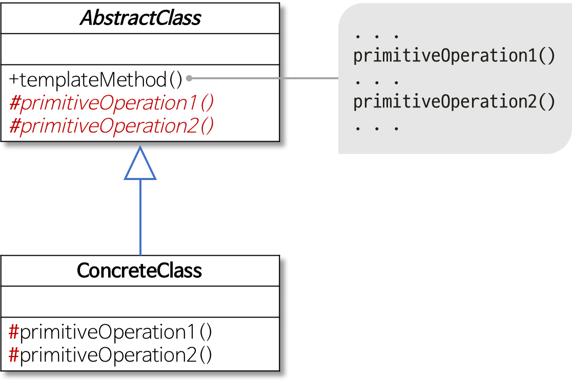 하위 클래스에 공통 알고리즘을 정의하고 하위 클래스에서 구현될 기능을 primitive 메서드 또는 hook 메서드로 정의하는 클래스 - ConcreteClass