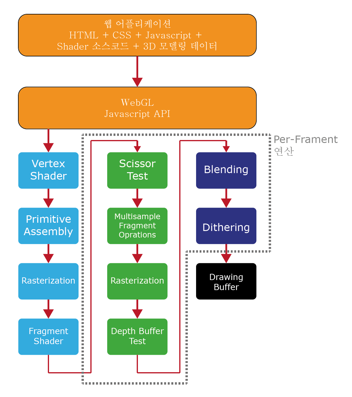 : (웹 애플리케이션 HTML + 자바스크립트 + 쉐이더 소스코드 + 3차원 모델링데이터) → WebGL(자바스크립트 API) → 버텍스 쉐이더 → 프리미티브 어셈블리 → 레스터화 → 프래그먼트 쉐이더 → 가위테스트 → 멀티샘플 프래그먼트 연산 → 스텐실 테스트 → 깊이 버퍼 테스트 → 블렌딩 → 디더링 → 그리기 버퍼
